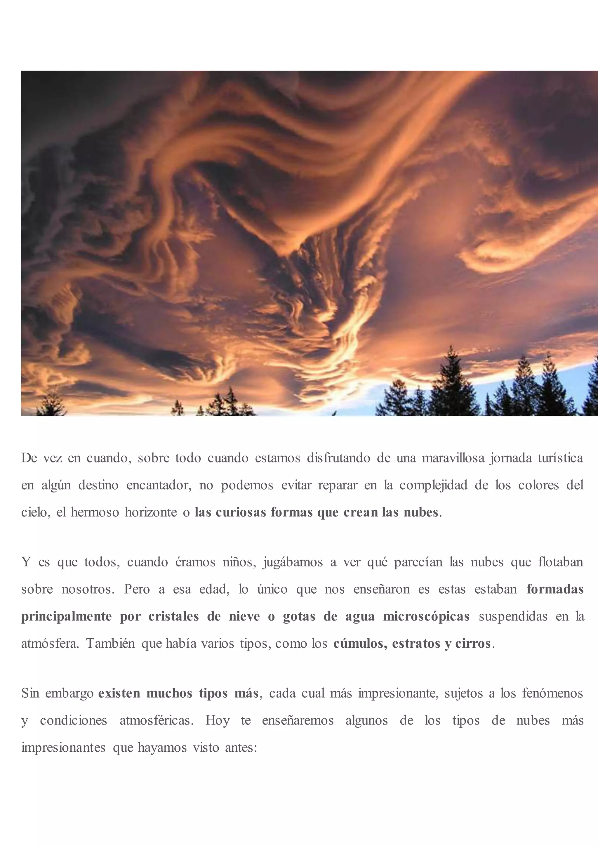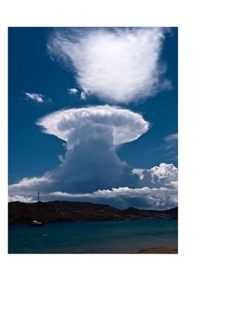 Este documento describe diferentes tipos de nubes impresionantes, incluyendo nubes lenticulares que se parecen a platillos voladores, nubes rodillo que son difíciles de avistar cerca de la costa, y nubes de Kelvin-Helmholtz que parecen olas en el cielo pero solo duran unos instantes. También describe nubes como las mesosféricas polares, nubes mastodónticas que parecen células de tormenta, y la nube enredadera de Australia.