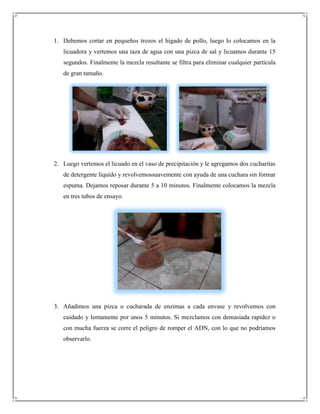 El documento describe un experimento para extraer ADN de forma casera utilizando materiales de bajo costo como hígado de pollo, licuadora, detergente y alcohol. Se detalla el procedimiento que incluye licuar el hígado, añadir detergente, enzimas de piña y luego vertir alcohol lentamente para que el ADN se separe y flote arriba en forma de filamentos blancos. El experimento demostró con éxito que se puede aislar ADN sin equipo óptico costoso mediante esta técnica casera.