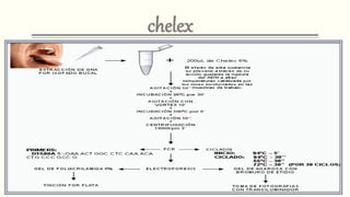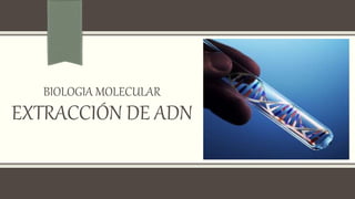 El documento describe los métodos para la extracción de ADN, incluyendo la homogenización de la muestra, la separación y purificación para eliminar proteínas u otros contaminantes, y la precipitación del ADN. Tres métodos comunes son el fenol-cloroformo, el Chelex y el salting out, los cuales varían en su toxicidad y capacidad para prevenir la degradación del ADN.