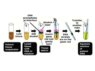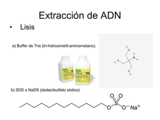 El documento describe los pasos para la extracción de ácidos nucleicos como ADN y ARN. Incluye las etapas de lisis celular mediante buffer y SDS, degradación proteica con enzimas proteasas, separación de fases con fenol-cloroformo, y purificación del ADN a través de precipitación con etanol y centrifugación. Finalmente, menciona la electroforesis como técnica para analizar los ácidos nucleicos extraídos.