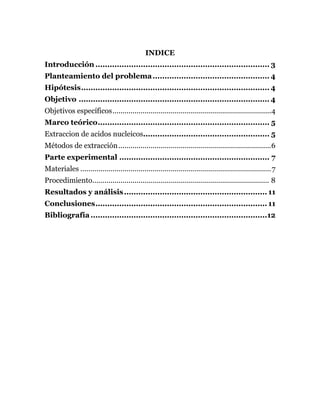 Este documento describe un experimento para extraer ADN de un tomate. Los estudiantes utilizaron técnicas sencillas como licuar el tomate, agregar sal y jabón para romper las membranas celulares, y luego agregaron alcohol para precipitar el ADN y separarlo de otros componentes celulares. Observando hebras de material en el tubo de ensayo después de agregar el alcohol, los estudiantes concluyeron que habían extraído con éxito ADN del tomate.
