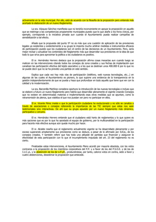 El acta resume una sesión del pleno corporativo municipal donde se debatió una propuesta de Izquierda Unida sobre participación ciudadana. La propuesta buscaba desarrollar plenamente el reglamento de participación existente y crear nuevos consejos y foros ciudadanos. Otros grupos apoyaron la necesidad de participación pero sugirieron actualizar el reglamento con las nuevas tecnologías. Tras el debate, la propuesta fue rechazada por mayoría absoluta.