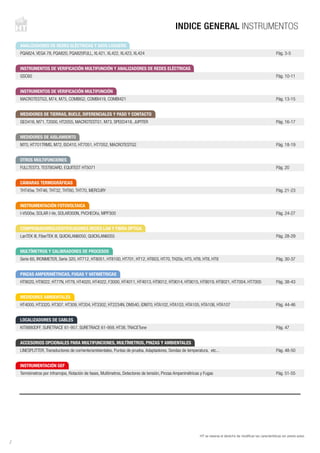 El documento es un extracto de un catálogo de instrumentos de medición y verificación de la marca HT, que incluye analizadores de redes eléctricas, medidores y otros equipos auxiliares para instalaciones civiles e industriales. Se detallan las características, funciones, y especificaciones técnicas de cada instrumento, así como los accesorios disponibles. Además, se menciona que la empresa se reserva el derecho de modificar las características sin previo aviso.