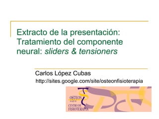 El documento describe varios ejercicios de estiramiento neural llamados "sliders" y "tensioners" para pacientes. Los ejercicios incluyen darse una patada en la cabeza, tocar la cabeza con el talón y deslizar un taburete, y se basan en pruebas como el slump test, ULNT1 y SLR para tratar problemas neurales.
