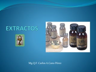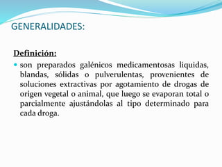 Este documento proporciona información general sobre los extractos. Define los extractos como preparados medicinales derivados de plantas u otros organismos que concentran los metabolitos activos. Explica que los extractos tienen una mayor potencia terapéutica que las drogas originales y son más estables. Además, clasifica los extractos en fluidos, secos y blandos, describiendo brevemente sus características y usos. Resalta la importancia de los extractos en la fabricación de diferentes formulaciones farmacéuticas y su potencial para encontrar nuevos fármacos.