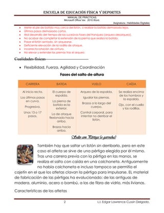 El documento describe diferentes pruebas de salto en atletismo. Explica que los saltos tradicionales de altura y longitud ahora también son practicados por mujeres. Describe las características y fases del salto de altura, salto con pértiga, salto de longitud y triple salto. Señala que estos eventos requieren cualidades como velocidad, flexibilidad, fuerza y coordinación.
