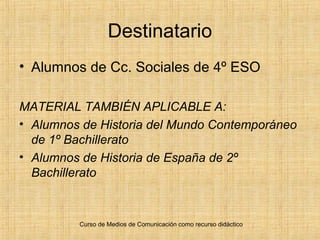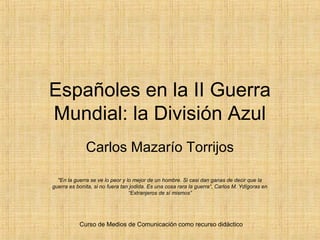 Este documento presenta una unidad didáctica para estudiantes de 4o de ESO y Bachillerato sobre la División Azul española en la Segunda Guerra Mundial. La unidad utiliza el documental "Extranjeros de sí mismos" para que los estudiantes conozcan la posición de España en la guerra y valoren las técnicas de historia oral. El documental y debate posterior ayudarán a los estudiantes a contrastar la teoría aprendida con diferentes puntos de vista sobre el frente oriental y la tentación fascista de Franco.