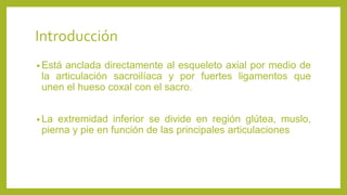 Este documento describe la anatomía de la extremidad inferior humana. Se divide en cuatro regiones principales: la región glútea, el muslo, la pierna y el pie. Describe los huesos, articulaciones, músculos, funciones y inervación de cada región. La extremidad inferior soporta el peso del cuerpo y permite la locomoción a través de la flexión, extensión y rotación de las articulaciones de la cadera, rodilla y tobillo.