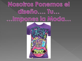 Este documento presenta los resultados de una encuesta realizada entre estudiantes sobre su preferencia por playeras y camisetas. La mayoría estaría dispuesta a pagar $30 por una playera, y el color preferido para el diseño es el negro. El documento también menciona que la idea del producto fue muy bien recibida por la comunidad estudiantil.
