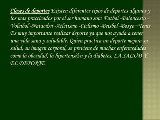 Este documento describe diferentes tipos de deportes populares como el fútbol, baloncesto, voleibol, natación, atletismo, ciclismo, béisbol, tenis y boxeo. Explica brevemente las reglas y características de cada uno. También destaca que practicar deporte mejora la salud, previene enfermedades y ayuda a tener una vida sana.
