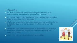 Este documento trata sobre el manejo avanzado de heridas. Explica que en Chile hay un aumento en la población adulta mayor y en enfermedades como la diabetes, lo que lleva a un mayor número de hospitalizaciones prolongadas para tratar complicaciones como el pie diabético. Luego describe diferentes tipos de heridas como venosas, arteriales, ulceras por presión y quemaduras, así como técnicas de curación y diferentes tipos de apósitos para tratar cada herida de manera efectiva y menos costosa.