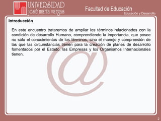 El documento aborda la concepción y los aspectos fundamentales del desarrollo humano, destacando su importancia en la creación de planes de desarrollo impulsados por diversos actores sociales. Se menciona el Índice de Desarrollo Humano (IDH) como una herramienta para medir el progreso en dimensiones como salud, educación y nivel de vida. Además, se exploran las diferencias entre crecimiento y desarrollo, haciendo hincapié en la multidimensionalidad de la pobreza y las capacidades humanas.
