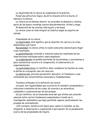 El documento discute varios temas relacionados con el conocimiento, incluyendo la ontogénesis, filogénesis, progreso, tipos de ciencia, características de la ciencia, conceptos, clasificaciones de conocimiento, y la sociedad del conocimiento. Define la sociedad del conocimiento como aquella donde el conocimiento es el principal componente de cualquier actividad y donde las TIC juegan un papel importante como factor de cambio social.
