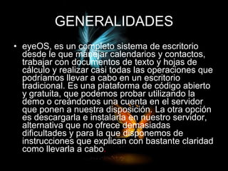 eyeOS es un sistema operativo de escritorio basado en la nube que permite acceder a aplicaciones como calendarios, contactos, procesadores de texto y hojas de cálculo desde cualquier navegador web sin necesidad de instalación. Incluye herramientas para la gestión y compartición de archivos y comunicaciones como correo y mensajería. Los desarrolladores pueden crear aplicaciones nuevas mediante widgets.