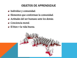 Este documento describe los elementos que conforman una comunidad moral y las acciones que promueven el desarrollo individual y comunitario. Explica que una comunidad está formada por individuos con intereses comunes y que cada individuo es único. También define la familia, la comunidad y el individuo. Luego describe actitudes como el altruismo, egoísmo e individualismo. Finalmente, discute la conciencia moral y diferentes concepciones filosóficas sobre el bien y la vida buena.