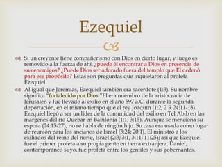 El documento describe el ministerio del profeta Ezequiel, quien fue llevado al exilio en Babilonia en el año 597 a.C. Ezequiel tuvo visiones de Dios que marcaron el inicio de su ministerio de predicar arrepentimiento y juicio a su pueblo. Su ministerio se dividió en dos períodos: del 592 al 586 a.C. anunció la destrucción de Jerusalén, y luego de esto predicó un mensaje de consuelo y restauración. Ezequiel usó diferentes métodos como sermones, dramatizaciones y a