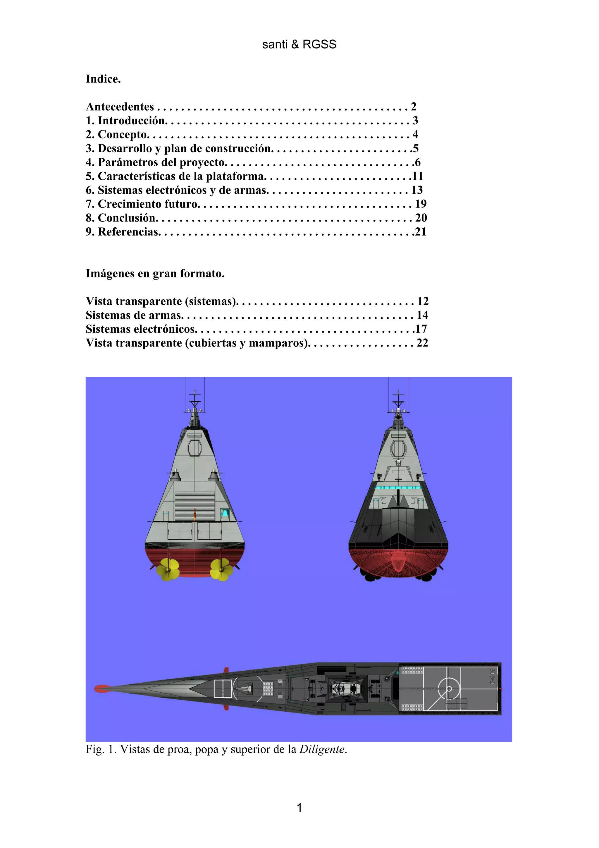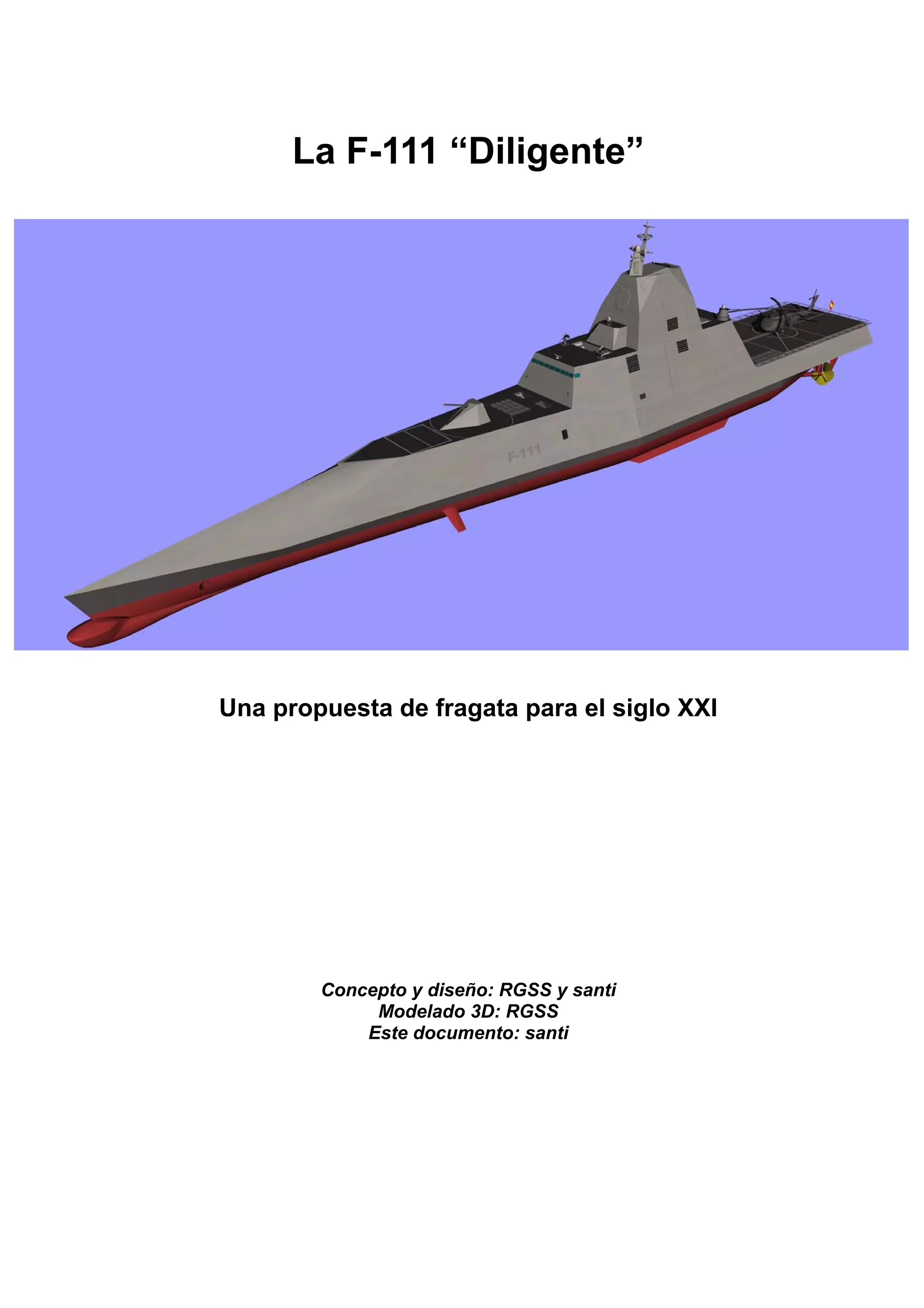 El documento presenta el concepto y diseño de una fragata propuesta llamada F-111 Diligente para sustituir a las fragatas clase Santa María de la Armada Española en el siglo XXI. La Diligente sería una fragata multifunción diseñada para operaciones en aguas litorales con bajos costes, gran autonomía, capacidad para usar drones, y detectabilidad reducida. El documento describe los sistemas de armas, electrónicos y otras características clave de la plataforma naval propuesta.