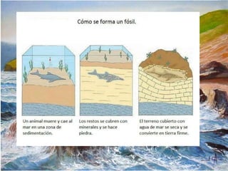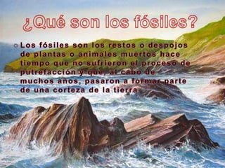 Este documento describe los diferentes tipos de fósiles y métodos de fosilización. Los fósiles más comunes son restos de conchas, caracoles u huesos. Existen varios métodos de fosilización como la petrificación, momificación e impresión, siendo la petrificación el método más utilizado donde los tejidos blandos se descomponen y se conservan las partes más duras.