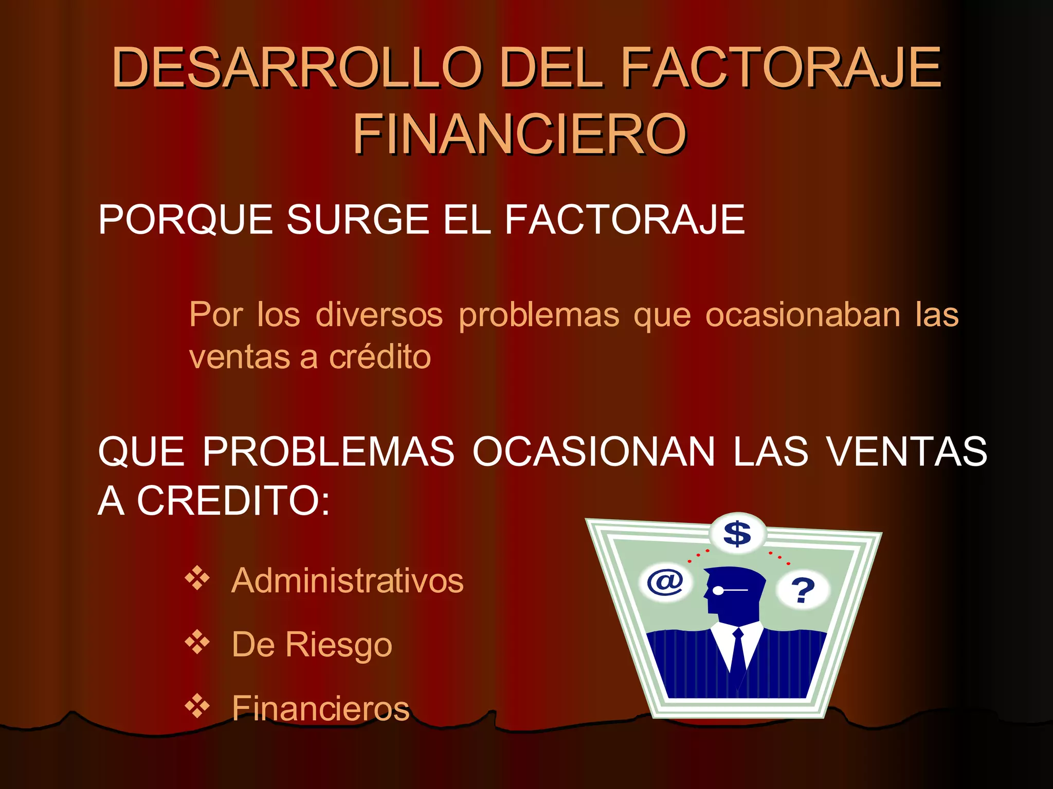 Este documento describe el factoraje financiero, un acuerdo entre una empresa y una compañía de factoraje mediante el cual la empresa cede sus cuentas por cobrar a cambio de servicios financieros y administrativos. Explica que el factoraje surgió para resolver problemas de administración, riesgo y liquidez causados por las ventas a crédito. También identifica a las partes involucradas, los objetivos, ventajas y tipos de factoraje, así como las empresas de factoraje que operan en México.