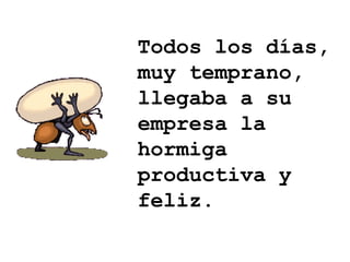 La historia cuenta la historia de una hormiga productiva y feliz que trabajaba en una empresa. Con el tiempo, la gerencia contrató más y más supervisores, asistentes, consultores y gerentes para supervisar a la hormiga, a pesar de que ella seguía siendo productiva. Finalmente, debido a la gran burocracia generada, la empresa despidió a la hormiga productiva a pesar de su buen desempeño.