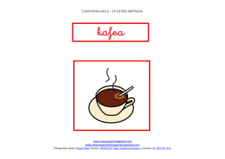 Este documento presenta una lista de palabras que comienzan con la letra F en forma de pictogramas. Cada palabra está representada por un pictograma e incluye su escritura en alfabeto latino debajo. Las palabras incluyen términos como familia, fútbol, fiesta y otros.
