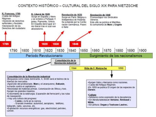 Este documento presenta un resumen de la vida y obra de Friedrich Nietzsche. Comienza con el contexto histórico y filosófico de la época de Nietzsche, luego describe las tres etapas de su vida y obra. También introduce brevemente su filosofía, la cual incluye una crítica a la cultura occidental a través de su crítica a la moral, la filosofía, las ciencias positivas y su idea del nihilismo.