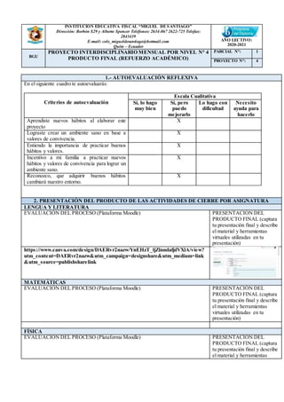 Este documento presenta el proyecto interdisciplinario mensual N° 4 de un estudiante de 1er año de educación secundaria. Incluye una autoevaluación del estudiante sobre sus hábitos y valores, así como presentaciones de productos finales en cada asignatura realizadas a través de plataformas como Canva y SlideShare utilizando herramientas digitales. Finalmente, contiene una rúbrica para la calificación del refuerzo académico por asignatura.