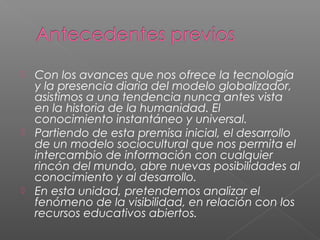 El documento analiza el fenómeno de la visibilidad y los recursos educativos abiertos en la era de la globalización y la tecnología. Gracias a Internet, el conocimiento es instantáneo y universal, permitiendo un intercambio de información sin precedentes. Los recursos educativos abiertos comparten información de forma gratuita a través de canales como blogs y redes sociales. Sin embargo, es importante que los profesores guíen a los estudiantes para asegurar que acceden a información de calidad.