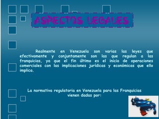 Las leyes que regulan las franquicias en Venezuela incluyen la Constitución, que protege el derecho a dedicarse a la actividad económica de preferencia, el Código Civil, que establece los principios para los contratos y las obligaciones entre partes, y las leyes laborales como la Ley del Trabajo, que rigen la contratación de personal para actividades mercantiles independientes.