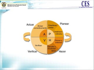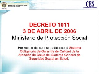 El documento establece el Sistema Obligatorio de Garantía de Calidad de la Atención de Salud del Sistema General de Seguridad Social en Salud de Colombia. Este sistema busca generar, mantener y mejorar la calidad de los servicios de salud a través de instituciones, normas, requisitos, mecanismos y procesos deliberados y sistemáticos. El documento describe los componentes del sistema como el Sistema Único de Habilitación, la Auditoría para el Mejoramiento de la Calidad y el Sistema de Información en