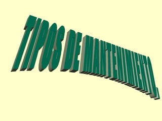 Este documento describe tres tipos principales de mantenimiento: preventivo, correctivo y predictivo. El mantenimiento preventivo incluye inspecciones periódicas y reemplazo de piezas antes de que fallen. El mantenimiento correctivo ocurre después de una falla para reparar el equipo. El mantenimiento predictivo busca detectar fallas futuras a través de pruebas para mantener el equipo funcionando de manera óptima.