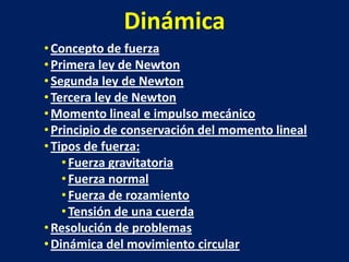 Este documento resume los principales conceptos de dinámica en 3 oraciones o menos por tema. Explica las leyes de Newton sobre fuerza e inercia, el momento lineal, impulso mecánico y conservación del momento. También define y explica conceptos como fuerza gravitatoria, normal, de rozamiento y tensión de cuerdas. Por último, ofrece consejos sobre resolución de problemas de dinámica.