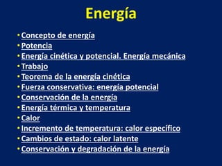 Este documento trata sobre conceptos relacionados con la energía. Explica que la energía es la capacidad de producir cambios o transformaciones y que existen diferentes tipos como la energía cinética, potencial, eléctrica, nuclear, térmica y química. También define conceptos como potencia, energía cinética, potencial gravitatoria y elástica, trabajo, conservación de la energía mecánica y fuerzas conservativas. Incluye ejemplos y ejercicios sobre estos temas.