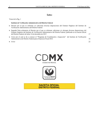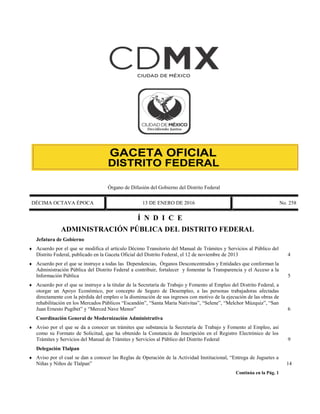 Este documento presenta varios acuerdos y decretos del Gobierno del Distrito Federal de la Ciudad de México. Modifica el plazo para inscribir trámites y servicios en el Registro Electrónico hasta el 30 de junio de 2016. Instruye a las dependencias a contribuir a la transparencia y acceso a la información pública. También instruye a la Secretaría de Trabajo y Fomento al Empleo a otorgar apoyo económico por concepto de seguro de desempleo a personas afectadas por obras en mercados públicos