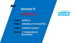 Este documento presenta el programa académico virtual de física para la semana 9. Cubre cuatro temas: la tercera ley de Newton, fuerzas usuales, la primera condición de equilibrio y estática. El objetivo es que los estudiantes comprendan las interacciones, fuerzas y equilibrio mecánico de los cuerpos. Incluye ejemplos de fuerzas como la gravedad, tensión, elástica y reacción de superficies.