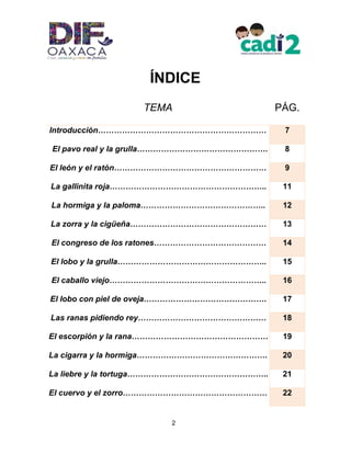 El documento recoge una colección de fábulas y cuentos para niños que enfatizan lecciones de vida y valores como la solidaridad, la humildad y la importancia de no menospreciar a los demás. A través de relatos clásicos como 'El león y el ratón' y 'La gallinita roja', se busca proporcionar a los niños recursos para enfrentar desafíos y fomentar su creatividad. Además, incluye una introducción reflexiva sobre la solidaridad humana en tiempos difíciles, destacando la relevancia de estos valores en el contexto actual.