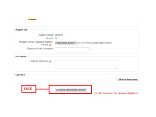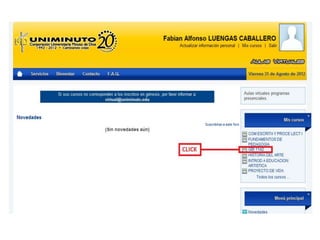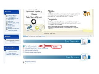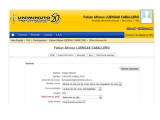 El documento presenta las tareas que Fabian Alfonso Luengas Caballero debe realizar en el aula virtual, incluyendo actualizar su información personal, participar en el foro y enviar un mensaje al profesor.
