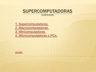 Este documento clasifica las computadoras en cuatro categorías: 1) supercomputadoras, que son muy potentes y rápidas para procesar grandes cantidades de información; 2) macrocomputadoras o mainframes, que son sistemas grandes para manejar cientos de usuarios y dispositivos simultáneamente; 3) minicomputadoras, que pueden soportar entre 10 y 200 usuarios simultáneos para almacenar datos y automatización; y 4) microcomputadoras o PCs, que son computadoras personales relativamente baratas usadas ahora en of