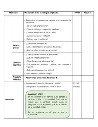 El documento presenta una secuencia didáctica para resolver problemas de cambio 3. La sesión comienza con la motivación a través de un problema ejemplo. Luego, se explica el esquema para resolver este tipo de problemas y los niños practican resolviendo otros ejemplos en grupos y de forma individual. Finalmente, se evalúa si los niños pueden identificar y resolver correctamente problemas de cambio 3.