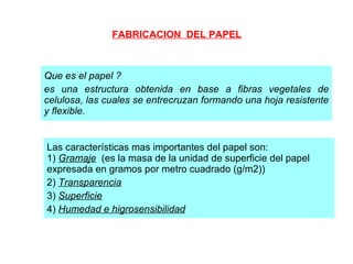 El documento describe los pasos del proceso de fabricación del papel, incluyendo la obtención de materias primas como fibras de madera y vegetales, la producción de pasta de papel, y la fabricación del papel propiamente dicha. También explica los diferentes tipos de papel según su uso, como papel de prensa, de impresión, higiénico-sanitario, para envases y embalajes, y especiales.