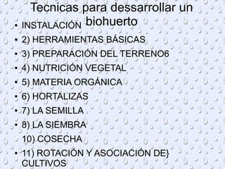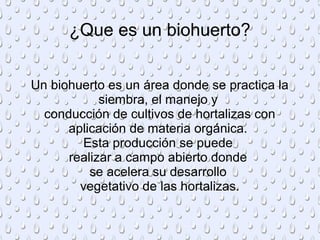 Un biohuerto es un área para cultivar hortalizas usando materia orgánica para acelerar su desarrollo vegetativo. Un biohuerto implica la instalación, herramientas básicas, preparación del terreno, nutrición vegetal con materia orgánica, siembra de hortalizas y semillas, cosecha, y rotación de cultivos.