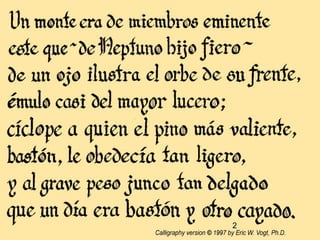 Este texto es un fragmento de la obra mayor de Luis de Góngora "La Fábula de Polifemo y Galatea" y contiene una descripción física del cíclope Polifemo a través de dos octavas reales. Se caracteriza por un lenguaje muy elaborado, culto y recargado, haciendo un uso profuso de recursos literarios como hipérbatos, perífrasis y metáforas extremadas.
