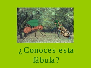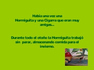 La fábula cuenta la historia de una hormiguita y una cigarra. La hormiguita trabajó todo el otoño almacenando comida para el invierno, mientras la cigarra cantaba y disfrutaba sin preocuparse por el futuro. Cuando llegó el frío, la hormiguita se resguardó en su guarida llena de comida, pero la cigarra le pidió alojamiento porque había firmado un contrato para shows en París tras ser descubierta cantando en un bar. La moraleja es aprovechar la vida trabajando y divirtiéndose.