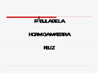 La fábula narra la historia de una hormiga maestra feliz que trabajaba contenta en su escuela hasta que se crearon nuevos puestos administrativos que aumentaron la burocracia y el papeleo, lo que la hizo sentir estresada. Finalmente, luego de que un consultor recomendara despedir personal, la hormiga maestra fue despedida.