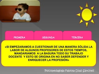 El documento critica la labor de algunos profesores actuales y cómo la educación ha cambiado de una forma errónea, poniendo más énfasis en las calificaciones que en formar estudiantes independientes. También resalta la importancia de que los maestros sean creativos e innovadores para mejorar la situación educativa, y concluye reconociendo lo difícil que es ser docente hoy en día y la necesidad de esforzarse por mejorar la educación.