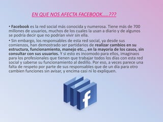 Facebook es la red social más grande con más de 700 millones de usuarios. Si bien permite establecer contactos y compartir contenidos, también tiene desventajas como cambios frecuentes en su funcionamiento sin consultar a los usuarios, exponer información personal si no se configura la privacidad adecuadamente, y la posibilidad de que surjan competidores que hagan sombra a Facebook en el futuro.