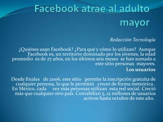 Facebook está atrayendo a un número creciente de adultos mayores. La edad promedio de los usuarios de Facebook es de 27 años, pero el número de usuarios mayores de 50 años ha mostrado un aumento del 513% en los últimos seis meses. Muchos adultos mayores usan Facebook para mantenerse en contacto con familiares y amigos, compartir fotos del pasado, y establecer nuevas relaciones sociales. Facebook ayuda a los adultos mayores a evitar el aislamiento y mantener su mente activa a través de la interacción y discusión en línea.