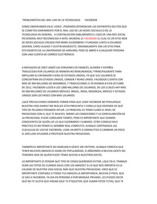 Facebook es una red social muy popular a nivel mundial que también conlleva riesgos si no se toman precauciones. Para usarla de forma segura y que no afecte la vida diaria, es importante configurar adecuadamente los niveles de privacidad, no agregar personas sin criterio para proteger la información personal y comunicar claramente a los amigos qué tipo de interacción se desea tener en la plataforma.