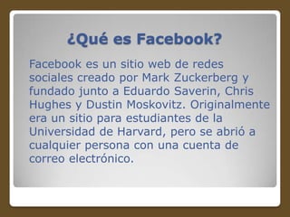 Facebook es una red social fundada por Mark Zuckerberg en 2004, inicialmente destinada a estudiantes de Harvard, que ha crecido hasta alcanzar más de 1000 millones de usuarios en todo el mundo. La plataforma permite a los usuarios conectar, compartir contenido y participar en grupos, con diversas características como el muro, chat y funciones de 'me gusta'. Su enfoque en la expansión y adaptación a diferentes idiomas ha contribuido a su éxito global, colocando a Facebook como una de las principales redes sociales del mundo.