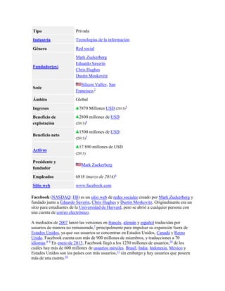 Este documento proporciona información general sobre Facebook, la red social creada por Mark Zuckerberg. Detalla que Facebook fue fundada en 2004, actualmente tiene más de 1000 millones de usuarios en todo el mundo, y ofrece servicios como perfiles de usuario, grupos, páginas, chat y compartir fotos y videos. También resume brevemente la historia de Facebook, su expansión internacional, servicios clave como el botón "Me gusta", y algunas métricas clave sobre su impacto e influencia a nivel mundial.